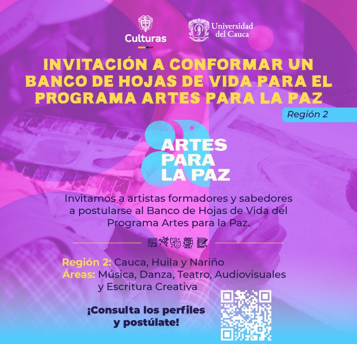 El Programa Artes para la Paz abre su convocatoria para conformar el Banco de Hojas de Vida en la Región 2: Cauca, Huila y Nariño, con el propósito de fortalecer una red de artistas comprometidos con la construcción de paz, la memoria y la reconciliación a través del arte y las tradiciones culturales.
