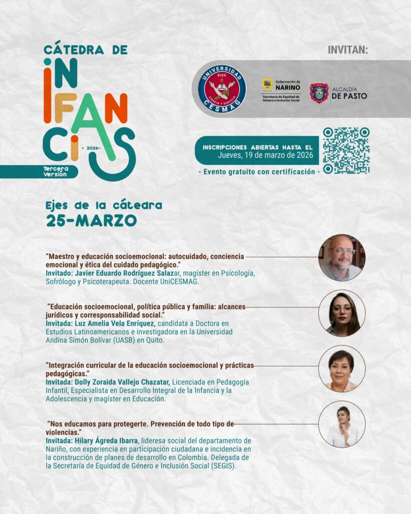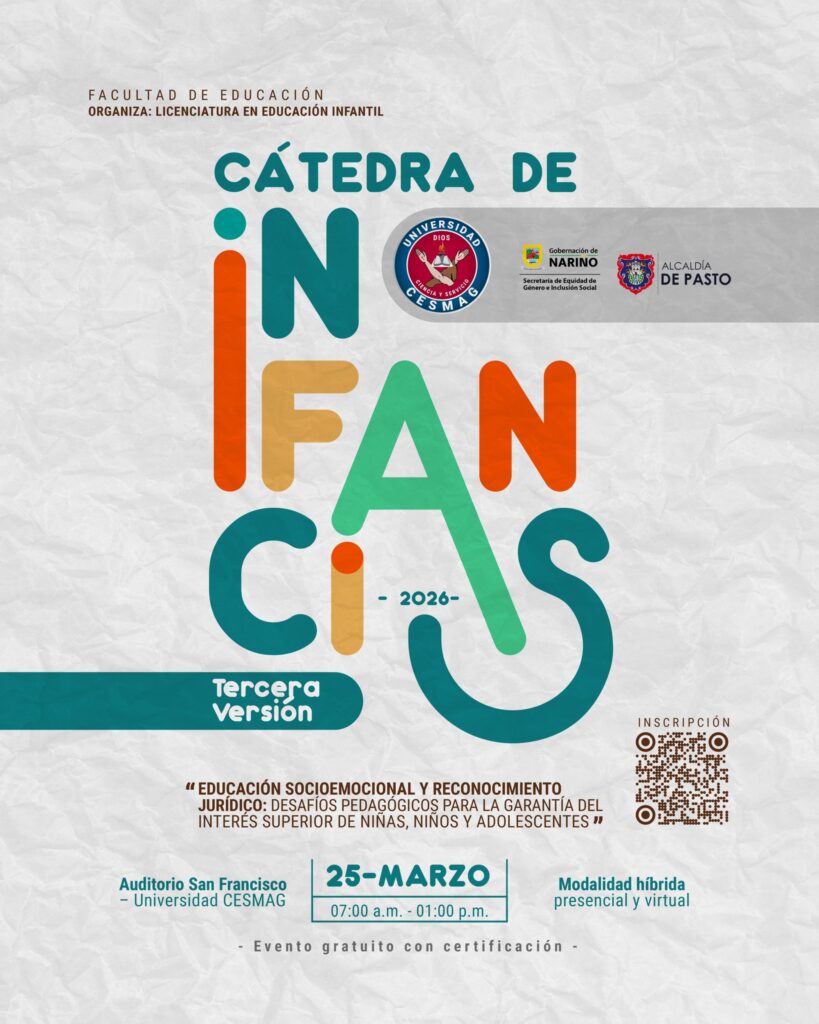 El Programa de Licenciatura en Educación Infantil de la Universidad CESMAG invita a participar en la III Versión de Cátedra de Infancias 2026. Un gran espacio de reflexión sobre educación socioemocional, derechos de la infancia y los desafíos pedagógicos para la escuela actual dirigido a docentes, profesional y comunidades educativas.