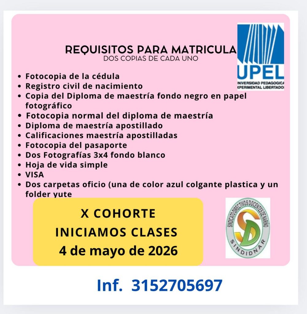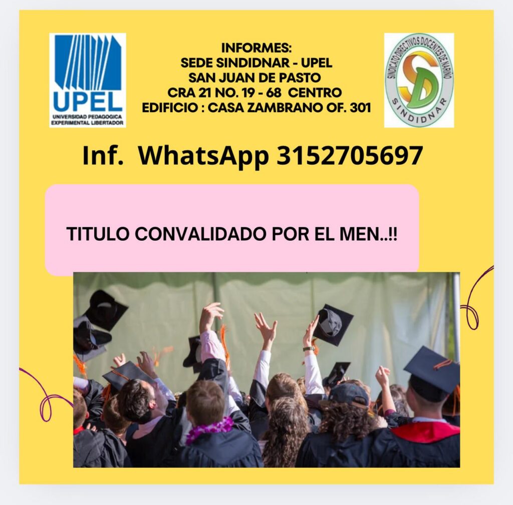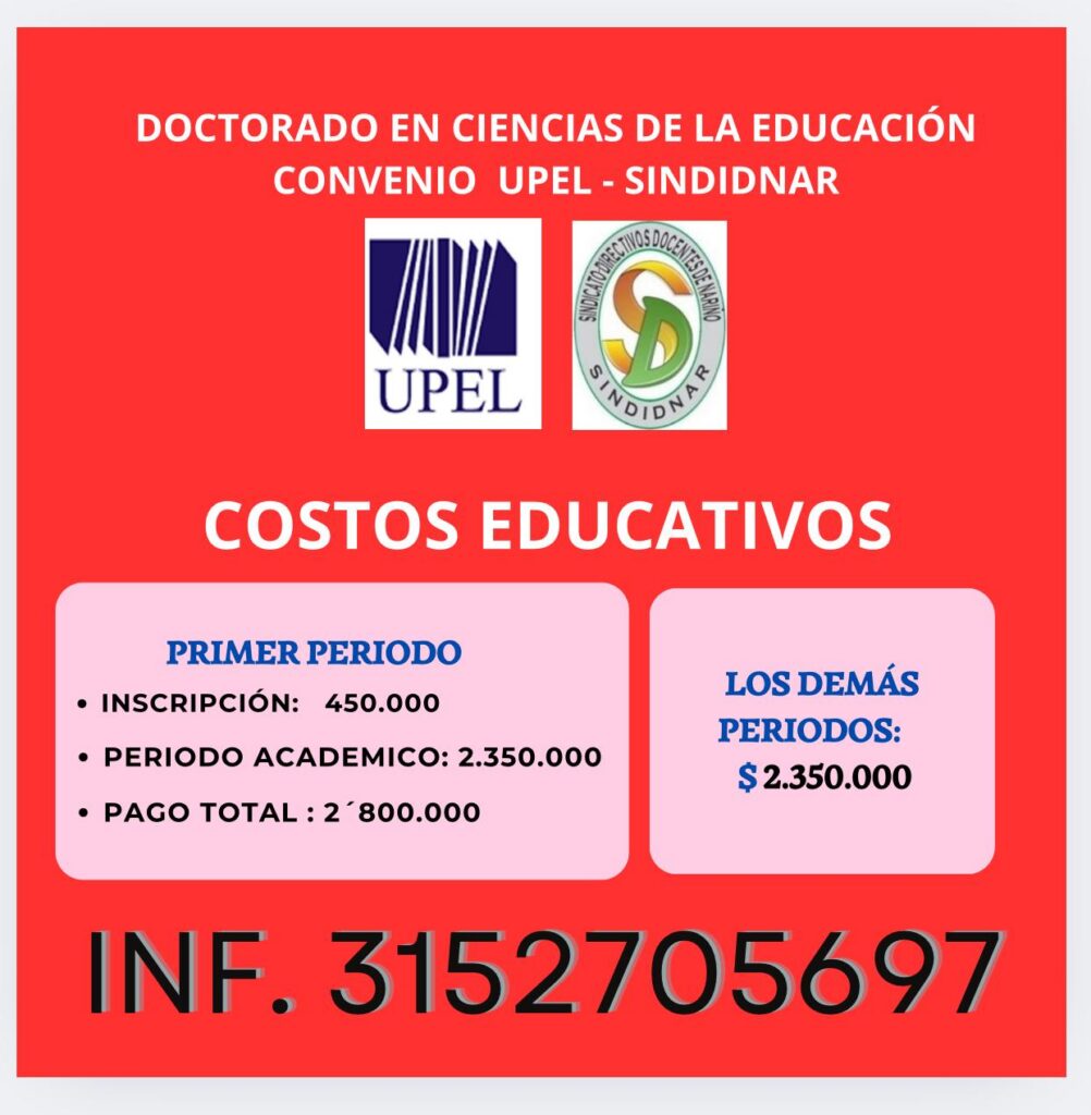 La Universidad Pedagógica Experimental Libertador UPEL y el Sindicato de Directivos Docentes de Nariño SINDIDNAR te invitan a cursar el Doctorado en Ciencias de la Educación. Duración tres años, modalidad semi presencial, virtual 95% .¡Inscripciones abiertas, cupo limitado! Más de 700 títulos convalidados por el Ministerio de Educación Nacional, válido para ascenso y mejoramiento salarial. En Nariño 382 docentes, directivos docentes y profesionales independientes ya están en proceso de formación.